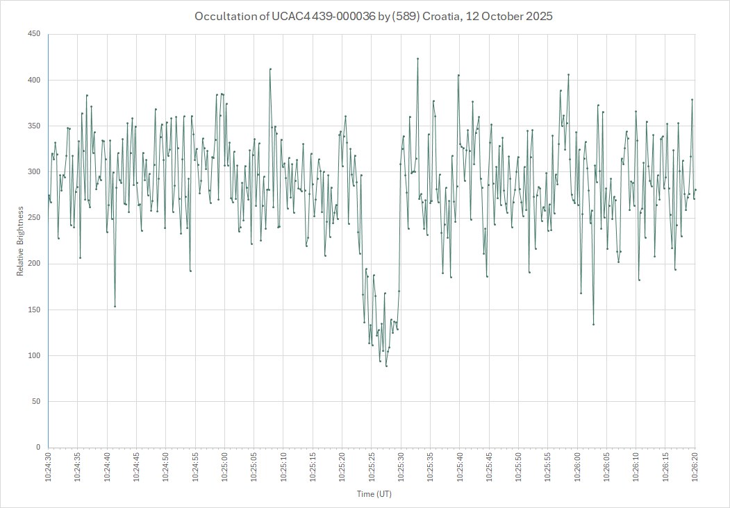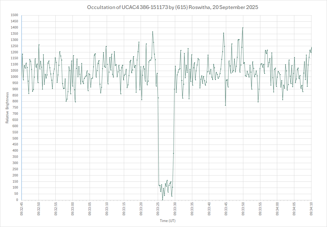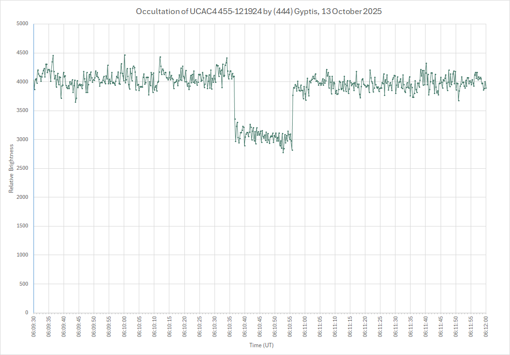 The method is straightforward: A precise measurement of how long a distant star's light is occulted (blocked) by a passing asteroid, together with the asteroid's previously-determined distance and speed, allows the asteroid's diameter to be calculated (by distance = rate x time). This measurement is accomplished via video photometry: video from a high-sensitivity camera attached to the telescope passes through a GPS-based device which "stamps" each video frame with the time (down to millisecond precision), to video recording devices (VHS and direct-to-hard drive). The video is analyzed with software that precisely measures the intensity of the target star in each video frame and assigns it a numerical relative brightness value. The light curve (a graph of brightness vs. time—see fig. 3, below) reveals the duration of the occultation.