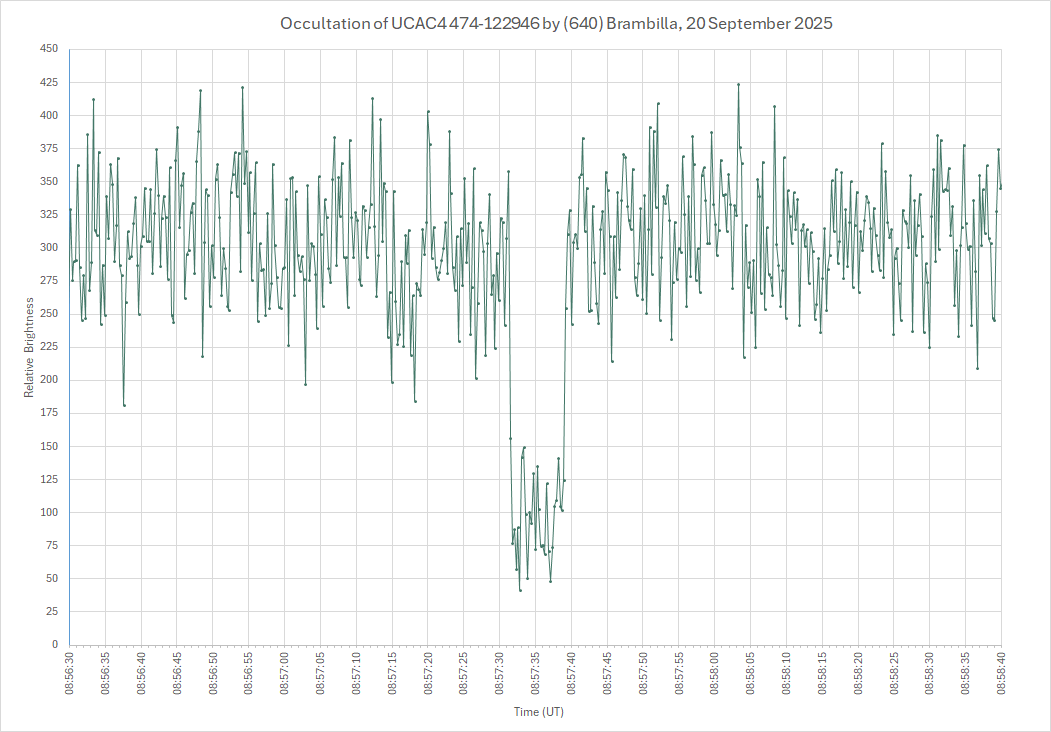 Fig. 3: Light curve of the 11 April 2017 (105) Artemis occultation, as derived by photometric video analysis. The jagged shape of the curve is due to a combination of signal noise and atmospheric distortion. For just over four seconds, the light of HIP 62736 was blocked by (105) Artemis, causing the signal to drop by around 85% (from the combined light of the star and asteroid, to the light of the much fainter asteroid alone plus background sky glow).